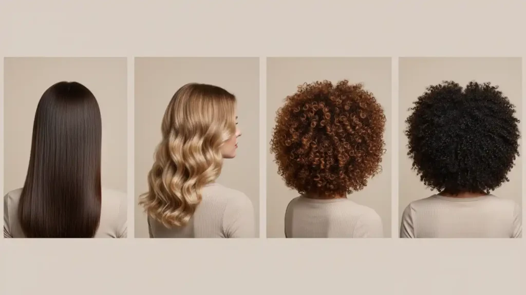 Hair types range from straight (Type 1) to wavy (Type 2) to curly (Type 3) to coily (Type 4). Each type has different needs: