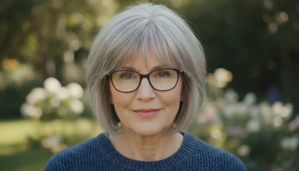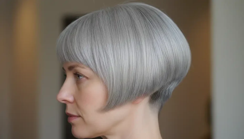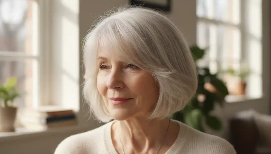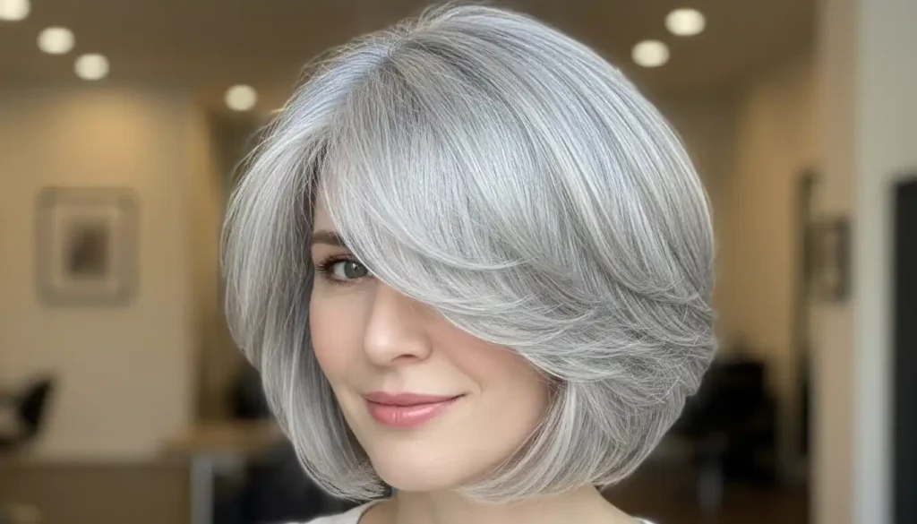 A soft gray bob with a side part creates natural fullness at the crown and a gentle sweep that adds movement. This works beautifully for women who are embracing their natural gray — the side sweep makes it look intentional and chic.