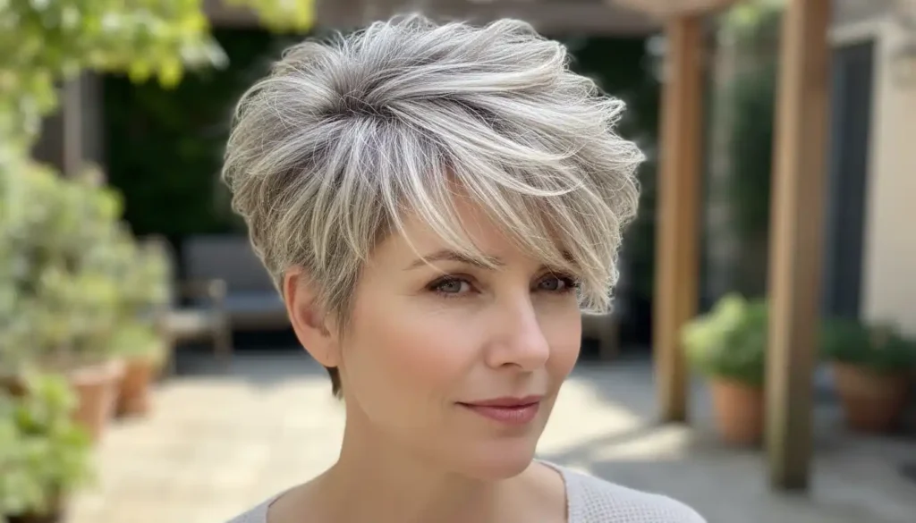 The rounded pixie cut creates fullness through its curved shape. It emphasizes texture and adds a sculptural quality that makes thinning hair look intentionally styled. The silvery shade adds a striking brightness that frames the face beautifully.