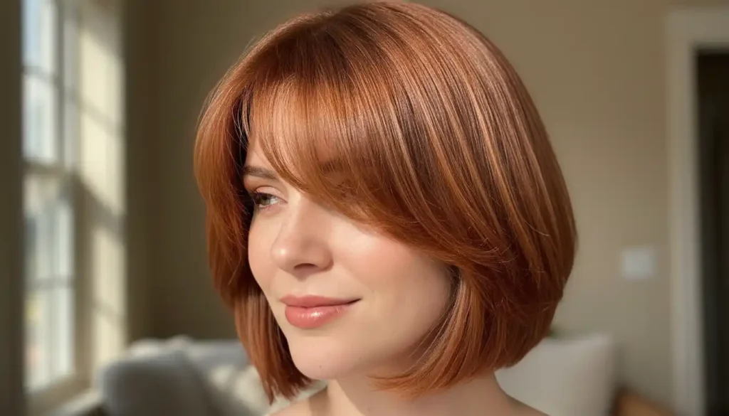 25. Layered Copper Bob with Side Bangs — Warm Tones for Maximum Impact