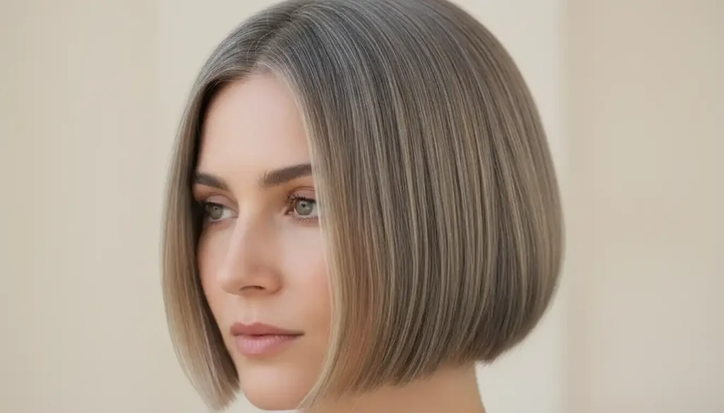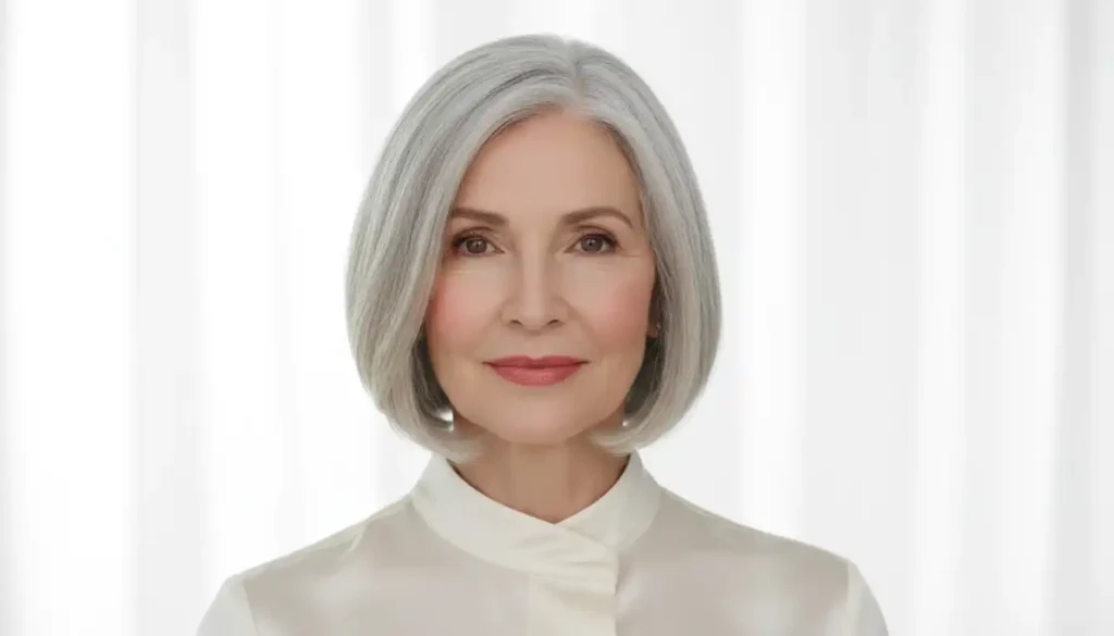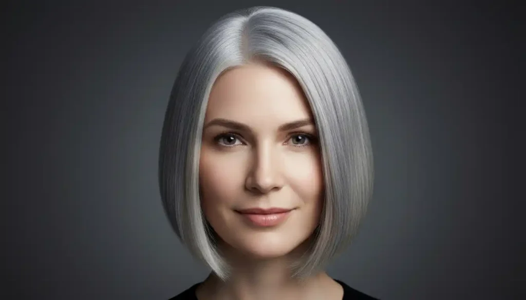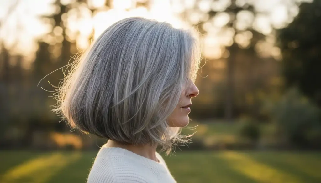 Gray hair doesn’t have to mean dull hair. A well-cut jaw-length bob in silver or salt-and-pepper actually reads as thicker than darker hair because light reflects off it differently. The slight taper at the ends of this cut gives hair a natural curve and body.